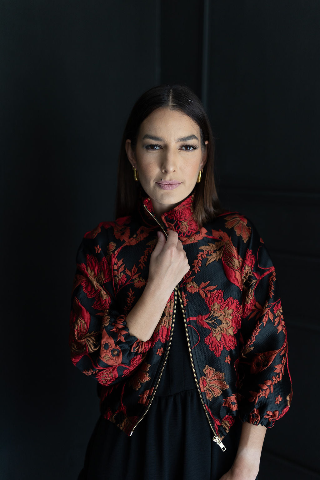 Made with intricate embroidery and a slight shimmer, the jacket captures attention from every angle, perfect for those who want to make a statement. Pair it with jeans for a casual look or dress it up with a skirt.